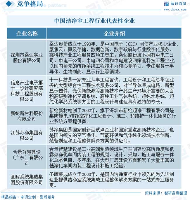 超潔凈環(huán)境控制又融合了風(fēng)險(xiǎn)評估、生產(chǎn)認(rèn)證的概念和程序,加之潔凈技術(shù)跨行業(yè)、跨專業(yè)、跨學(xué)科的特點(diǎn),使得潔凈室工程的難度和復(fù)雜性增加。因此對于潔凈室工程行業(yè)來說,優(yōu)化設(shè)計(jì)、現(xiàn)場施工環(huán)境的協(xié)調(diào)與管控、工程相關(guān)技術(shù)細(xì)節(jié)的經(jīng)驗(yàn)積累,對客戶需求的理解和實(shí)現(xiàn),以及對設(shè)計(jì)變更的準(zhǔn)備和響應(yīng)程度等都是衡量潔凈室工程企業(yè)競爭能力的重要指標(biāo)。?目前,我國潔凈室工程行業(yè)競爭較為激烈,企業(yè)數(shù)量較多。其中,桑達(dá)股份、十一科技、蘇凈集團(tuán)、新綸新材、柏誠股份、亞翔集成等設(shè)計(jì)研究院或建設(shè)承包企業(yè)在降低建造成本、提高潔凈室的穩(wěn)定性等方面占據(jù)優(yōu)勢,能提供高端潔凈室系統(tǒng)集成解決方案,位居行業(yè)領(lǐng)先地位。同時,行業(yè)內(nèi)還存在大量規(guī)模較小、技術(shù)水平與綜合解決方案能力有限的潔凈室工程企業(yè),普遍集中在對潔凈等級要求不高的低端市場。