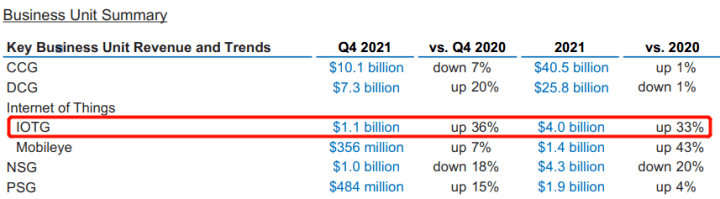 在晶圓代工巨頭臺積電公布的財(cái)報(bào)中,2021年其手機(jī)業(yè)務(wù)營收首次被HPC(大型高性能計(jì)算)業(yè)務(wù)超越,面向汽車板塊的營收和訂單需求也猛增。 圖像傳感器芯片設(shè)計(jì)龍頭韋爾股份最新財(cái)報(bào)顯示,其半導(dǎo)體業(yè)務(wù)收入同比增長18%,雖然智能手機(jī)CMOS占據(jù)營收大頭,但業(yè)績增長主要來源于車載CIS與安防CIS,尤其在安防領(lǐng)域?qū)崿F(xiàn)高達(dá)60%的業(yè)績增長。 2021年物聯(lián)網(wǎng)事業(yè)部(IoTG)成為國際半導(dǎo)體巨頭英特爾增長最快的業(yè)務(wù),同比增長33%,同時(shí)汽車自動駕駛業(yè)務(wù)也增速驚人,反觀主營PC終端的CCG部門業(yè)績僅增1個百分點(diǎn)。