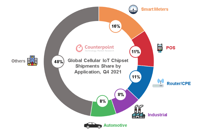 在蜂窩物聯(lián)網(wǎng)芯片中,當(dāng)前應(yīng)用規(guī)模最大的是低速率的NB-IoT芯片(占比60%),NB-IoT也是我國主推的物聯(lián)網(wǎng)連接方式,應(yīng)用在智能儀器表盤、資產(chǎn)追蹤等場景。其次是中速率的2G/3G(占比30%),用于移動支付、智能穿戴和智能家居中。4G Cat.1和5G大約占比10%, 5G模組的成本過高,加上大部分物聯(lián)網(wǎng)終端對傳輸速率的需求性不高,5G在物聯(lián)網(wǎng)終端的應(yīng)用占比較低,主要是自動駕駛和視頻監(jiān)控領(lǐng)域,但隨著2G/3G轉(zhuǎn)網(wǎng),Cat.1在智能支付、定位追蹤、車載終端、視頻監(jiān)控領(lǐng)域的高速增長,正逐漸打破蜂窩物聯(lián)網(wǎng)6:3:1的格局。從應(yīng)用場景來看,智能表計(jì)、POS支付、路由器/CPE、工業(yè)、汽車是蜂窩物聯(lián)網(wǎng)芯片應(yīng)用最廣泛的前五大場景。