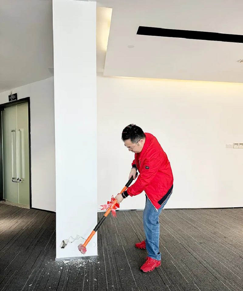 紅桌、紅錘、紅毯,色澤鮮亮紅潤的乳豬,紅紅火火!一錘開工大吉,二錘財(cái)源廣進(jìn),三錘萬事如意!伴隨著禮花的綻放,合景人手握禮錘,一同為新辦公區(qū)裝修開工儀式揭開序幕。在熱烈的掌聲中,大家共同慶祝辦公樓裝修工程的正式啟動(dòng)!